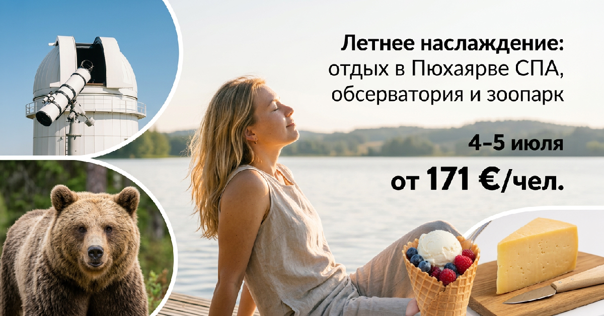 автобус, ночлег в 2-местном номере в отеле Пюхаярве СПА, завтрак, гид из Таллинна, экскурсии по Элва и Отепя, гид-экскурсовод в зоопарке Элиствере.